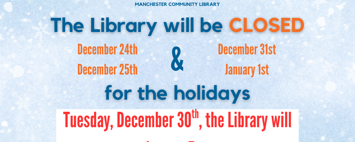 The Library will be CLOSED on December 24, December 25, December 31, and January 1 in observance of the holidays. The Library will close at 5pm on December 30th.