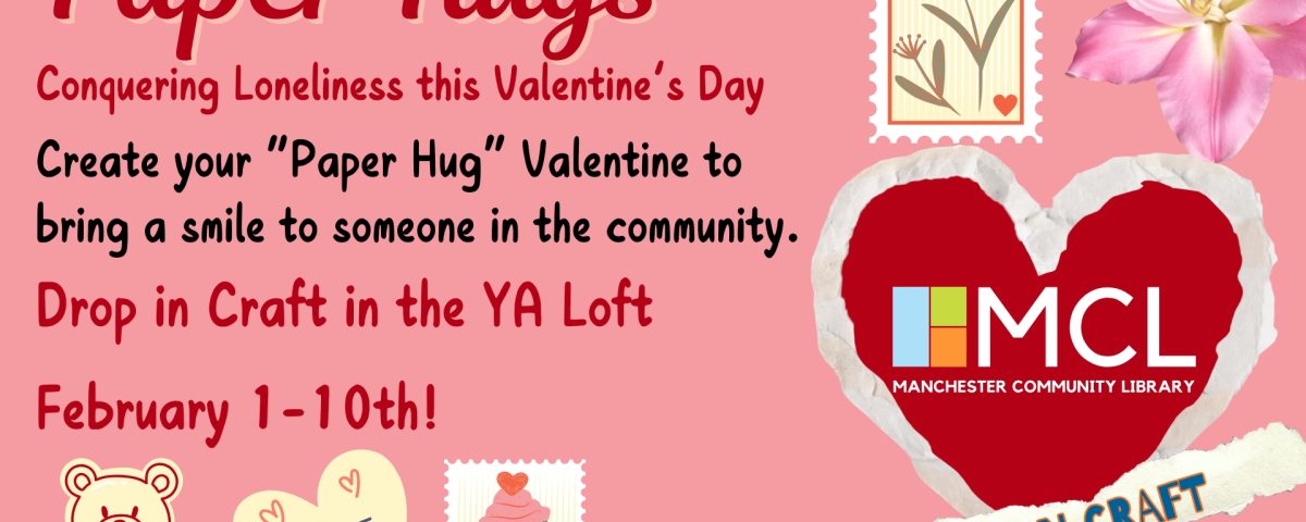 If you would like to contribute to the effort this year, stop by the Manchester Community Library between February 1st and February 10th. Supplies will be available in the Young Adult Loft during Library hours to construct your Paper Hugs. A collection box will remain at the MCL Help Desk until February 11th.